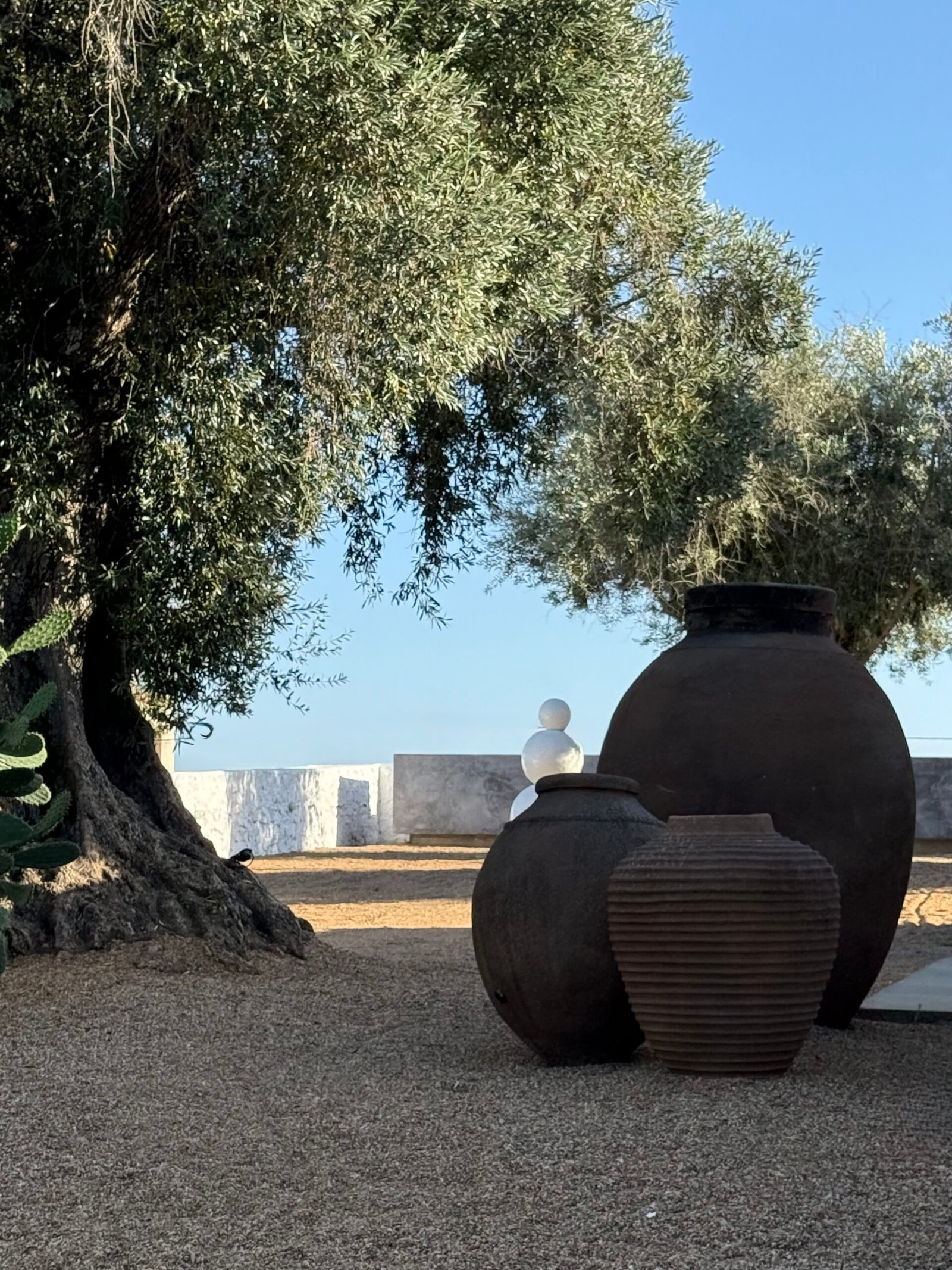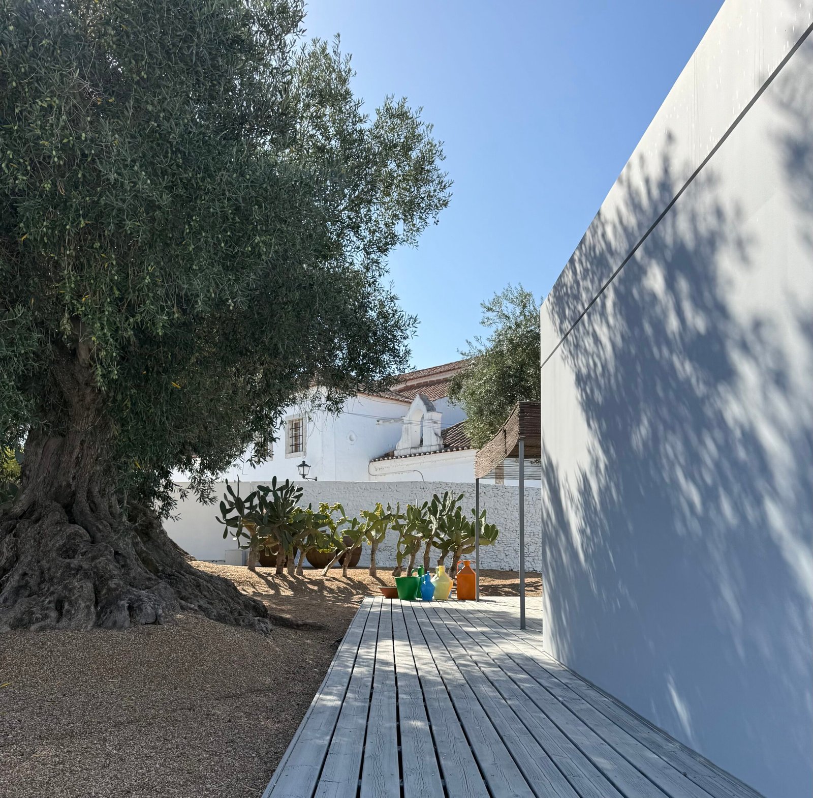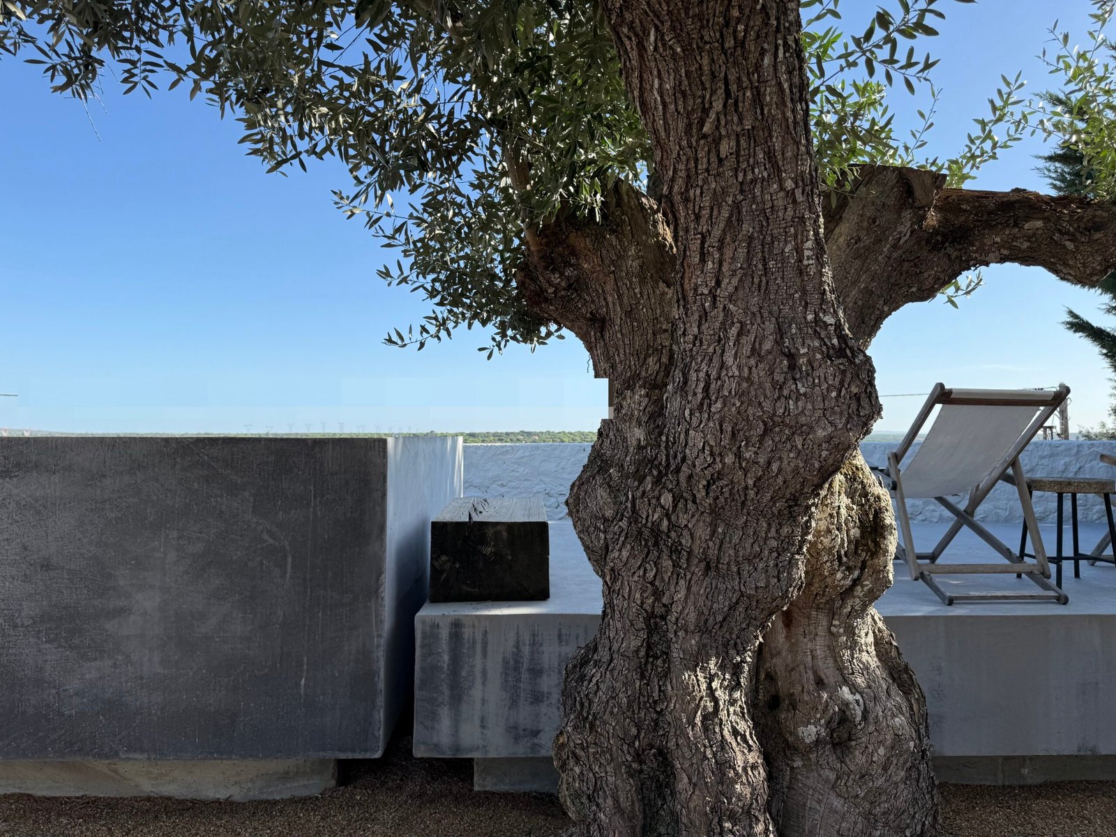 The architectural design emphasizes a dramatic interplay of materials and light: minimalist light-grey stucco and vast windows create a sharp, modern contrast against the plot’s ancient, whitewashed perimeter walls. This duality in design frames kaleidoscopic vistas, drawing the eye simultaneously towards a sun-drenched courtyard (graced by a thousand-year-old olive tree) and the imposing Arab fortress walls to the north.