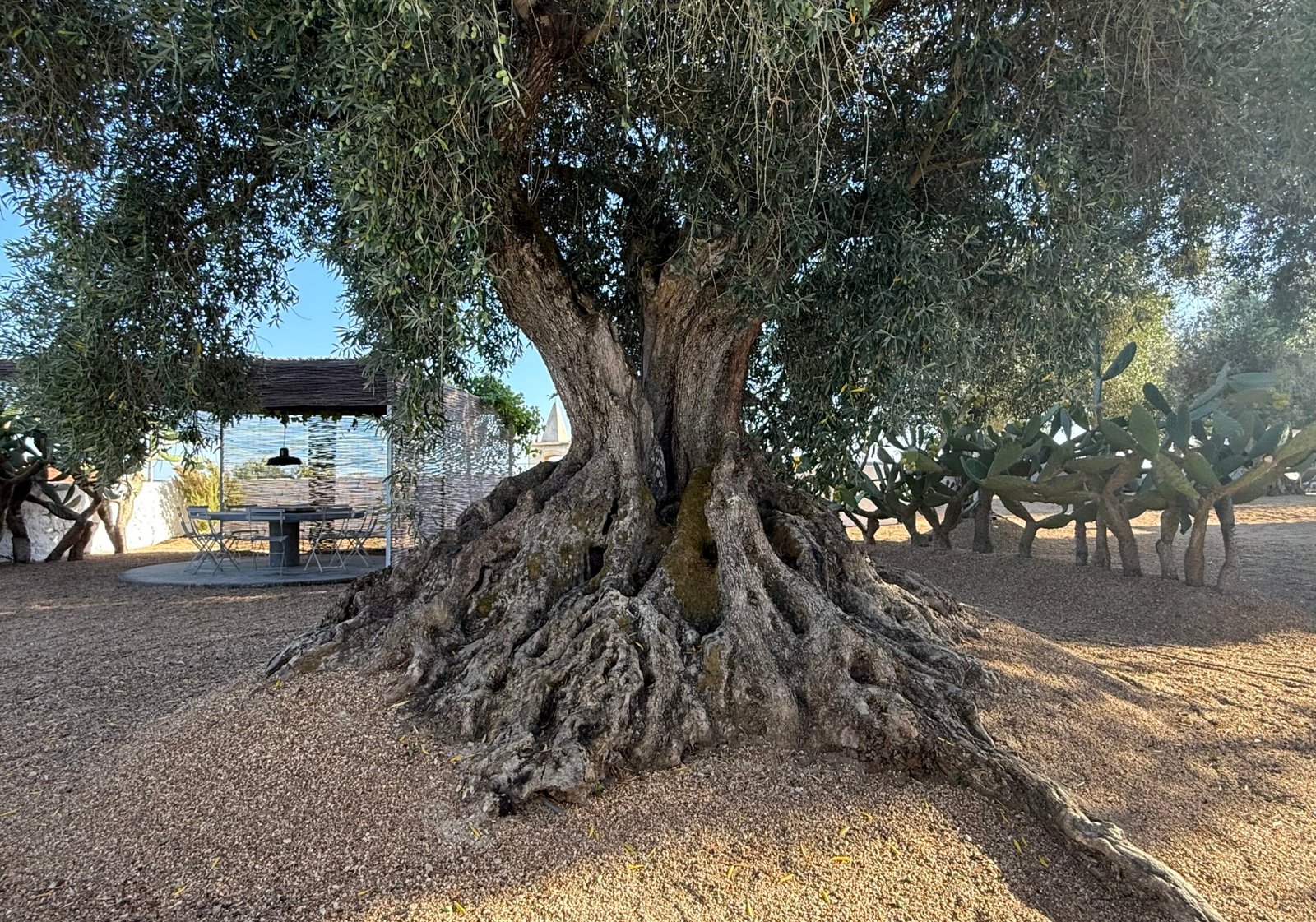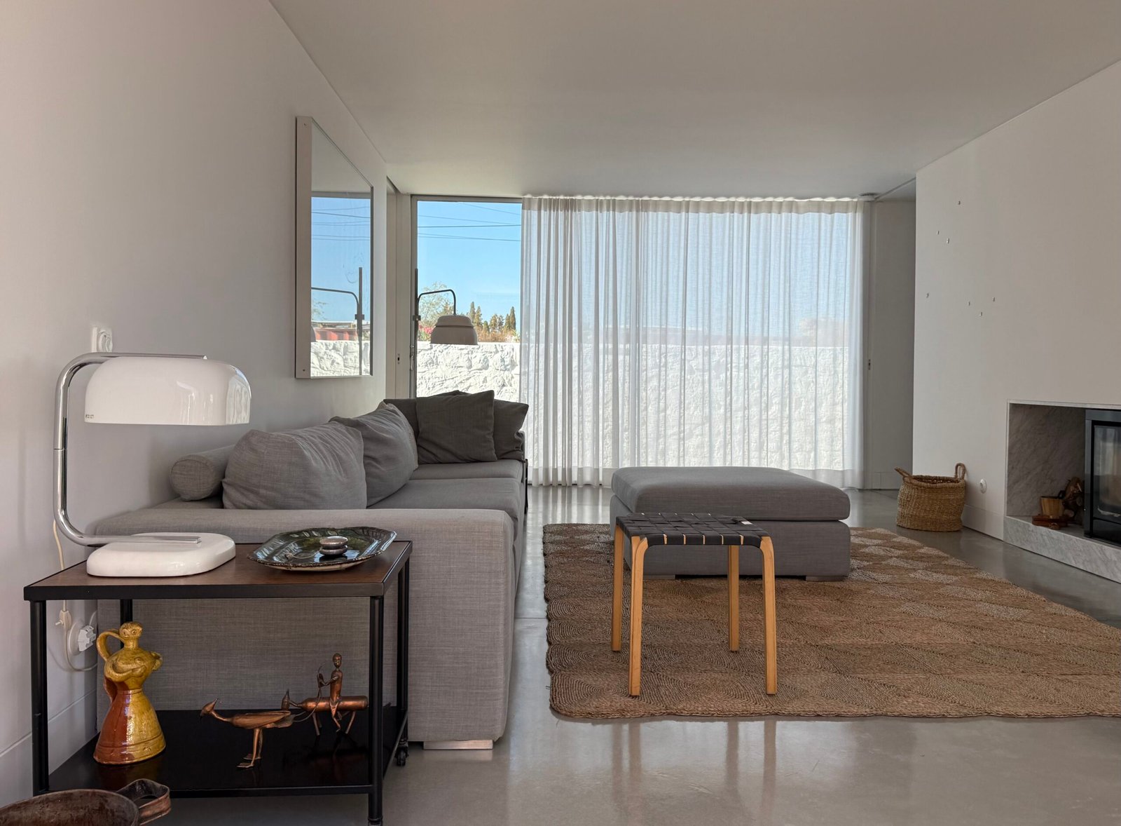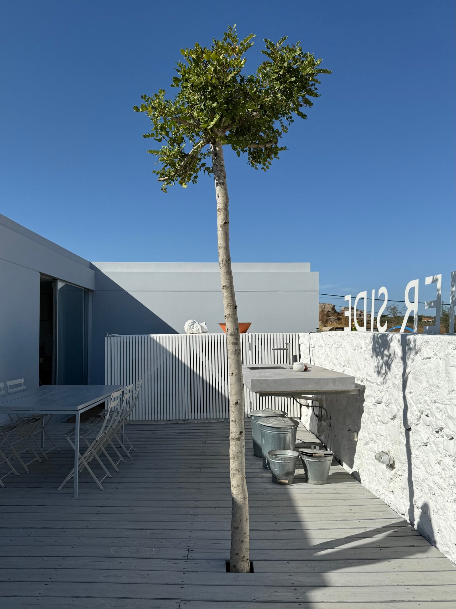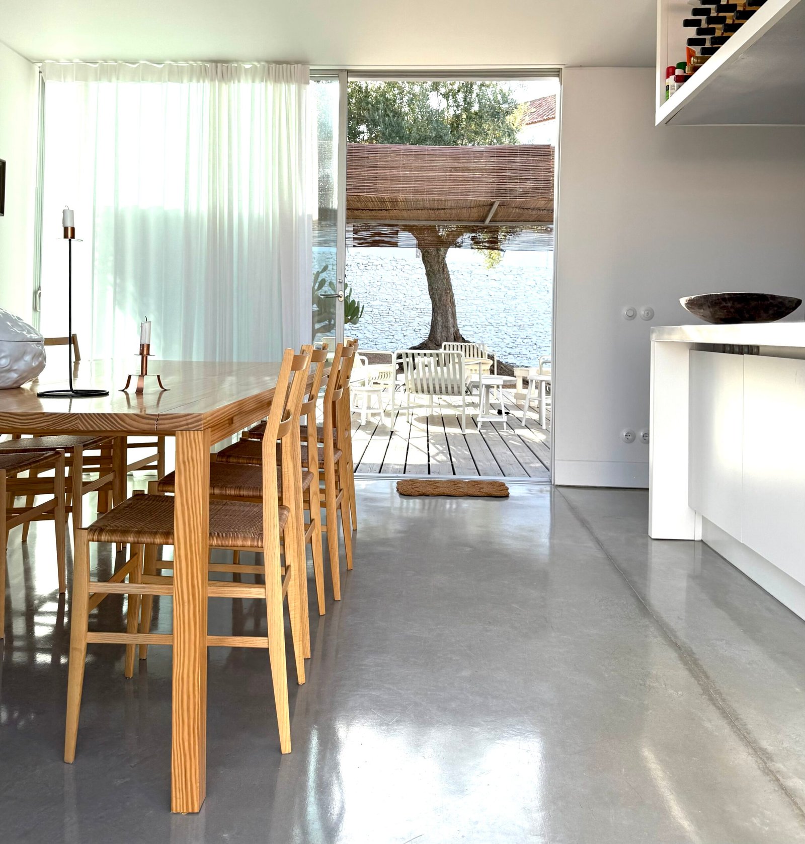 The architectural design emphasizes a dramatic interplay of materials and light: minimalist light-grey stucco and vast windows create a sharp, modern contrast against the plot’s ancient, whitewashed perimeter walls. This duality in design frames kaleidoscopic vistas, drawing the eye simultaneously towards a sun-drenched courtyard (graced by a thousand-year-old olive tree) and the imposing Arab fortress walls to the north.
